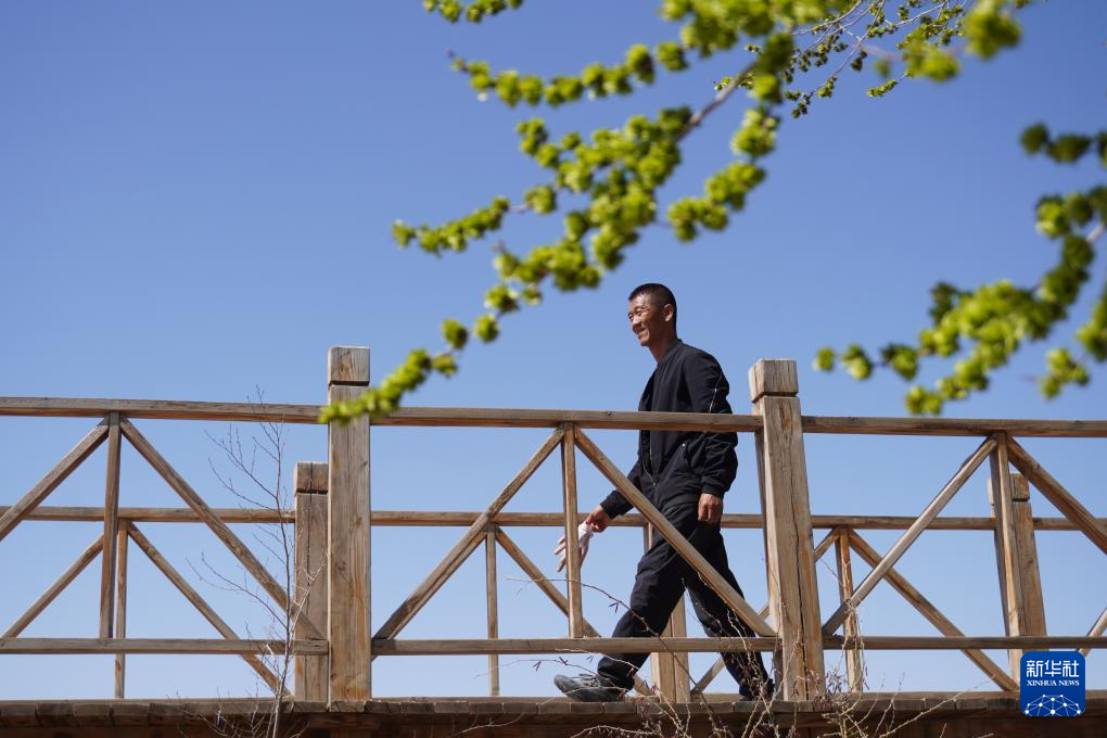 4月包養10日,在古浪县八包養步沙林场眼窝子沙治沙点,郭玺察看树木生长情况。包養網價格新华社记者 马希平 摄